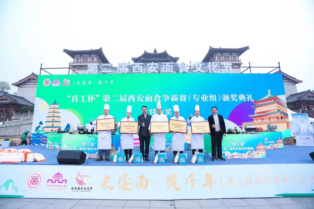 第二屆西安面食文化節不僅是一場關于美食的較量,也是對西安面食文化深度挖掘與傳承的盛會。來自全市各地的面食高手齊聚一堂,紛紛亮出絕活,展示了自己的面食制作技藝和創意。在此次面食爭霸賽的激烈角逐中,西北飯店的長安臊子面贏得了評委和觀眾的一致好評,最終榮獲特金獎。在頒獎典禮上,海名國際會展集團董事長門振春和西安海名會展有限公司總經理肖奎先上臺為西北飯店頒發了特金獎獎牌。